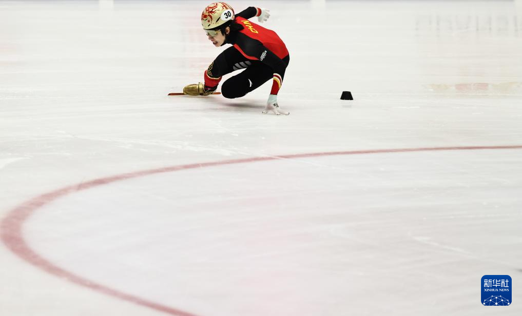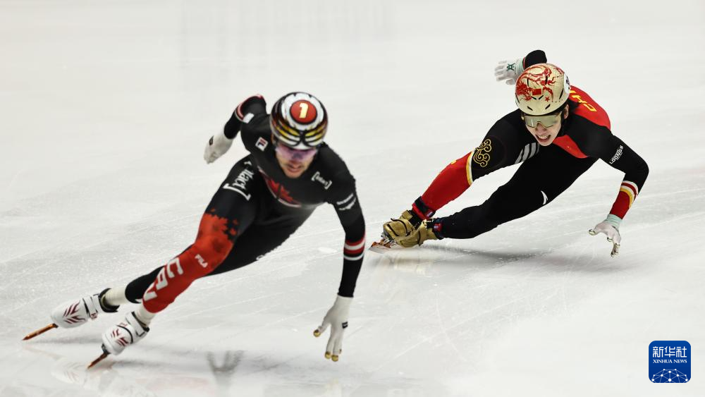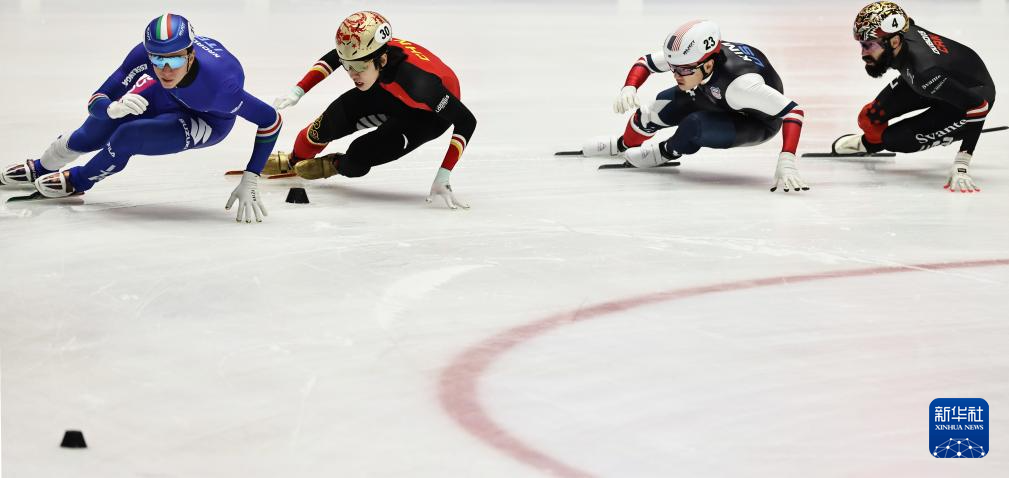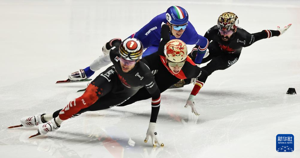 11月22日,加拿大选手丹吉努(左一)、中国选手林孝埈(左二)、加拿大选手杜波依斯(右一)在比赛中。