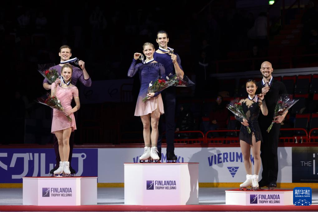 11月22日,双人滑冠军德国组合黑泽/沃罗登(中)、亚军美国组合叶菲莫娃/米特罗法诺夫(左)、季军美国组合埃莉·甘/奥谢在颁奖仪式上。