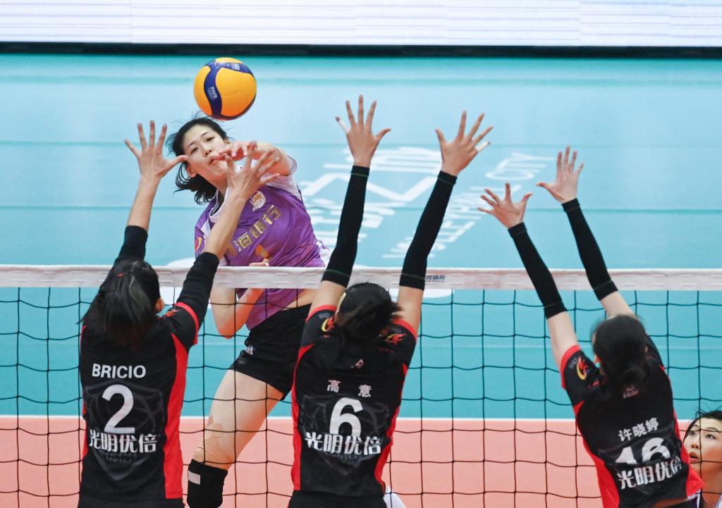 李盈莹(左二)在比赛中扣球(资料图)。新华社记者 赵子硕 摄
