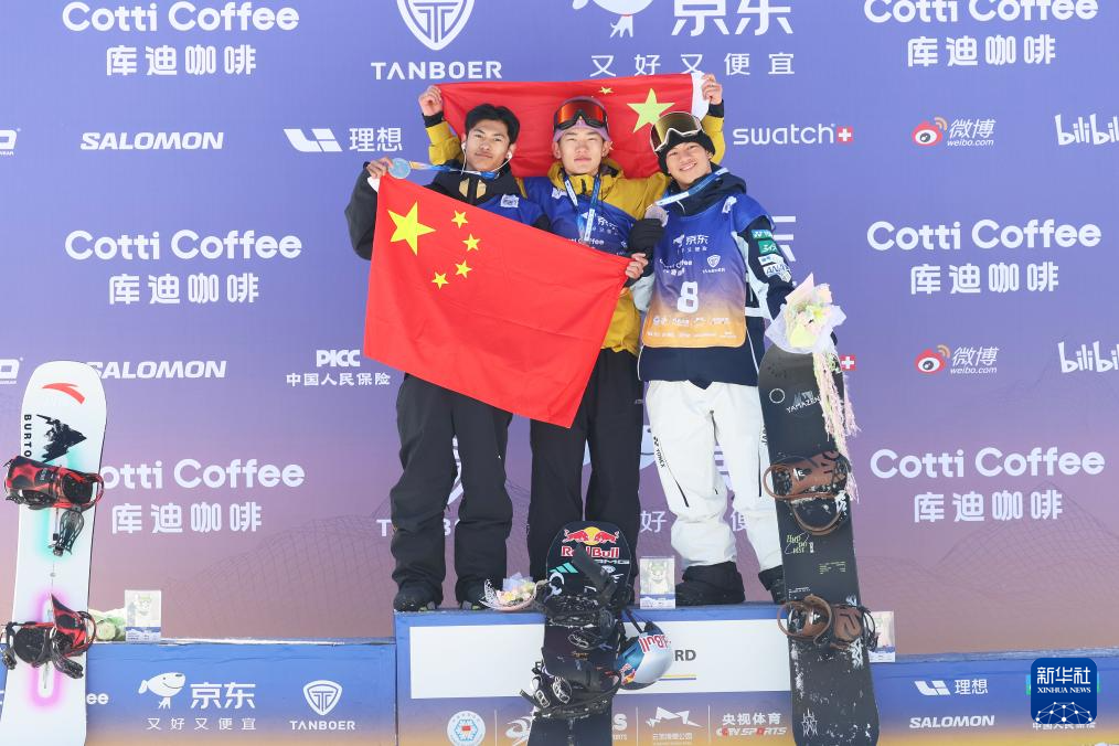 11月29日,冠军中国选手苏翊鸣(中)、亚军中国选手葛春宇(左)与季军日本选手木俣椋真在领奖台上庆祝。