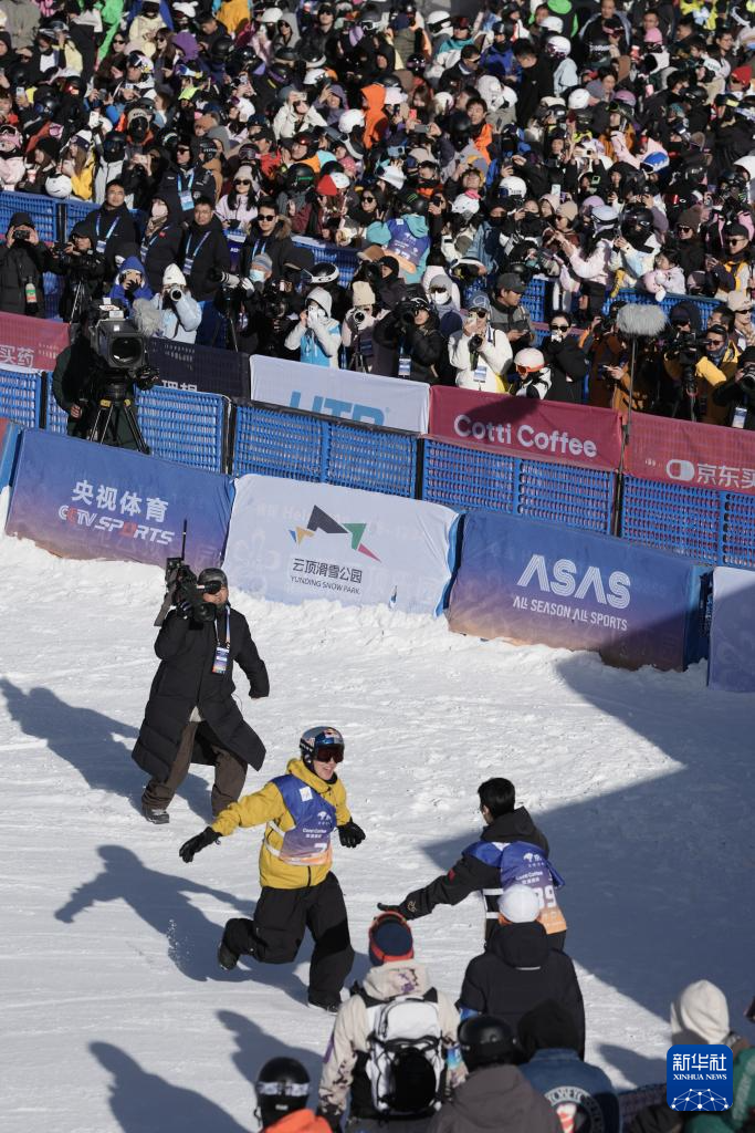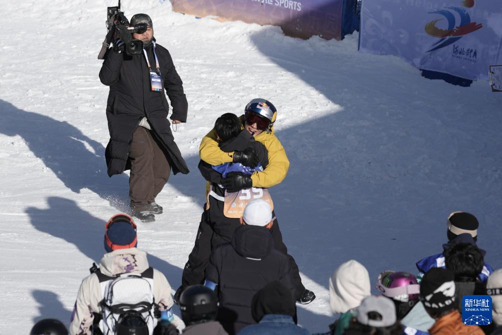 11月29日,中国选手苏翊鸣在决赛完成第三跳后冲向队友葛春宇庆祝。苏翊鸣与葛春宇分获冠、亚军。