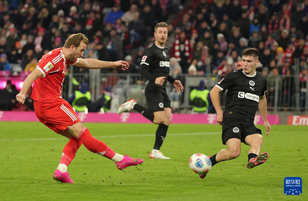 11月29日,拜仁慕尼黑队球员凯恩(左)和圣保利队球员佩尔卡(右)在比赛中拼抢。