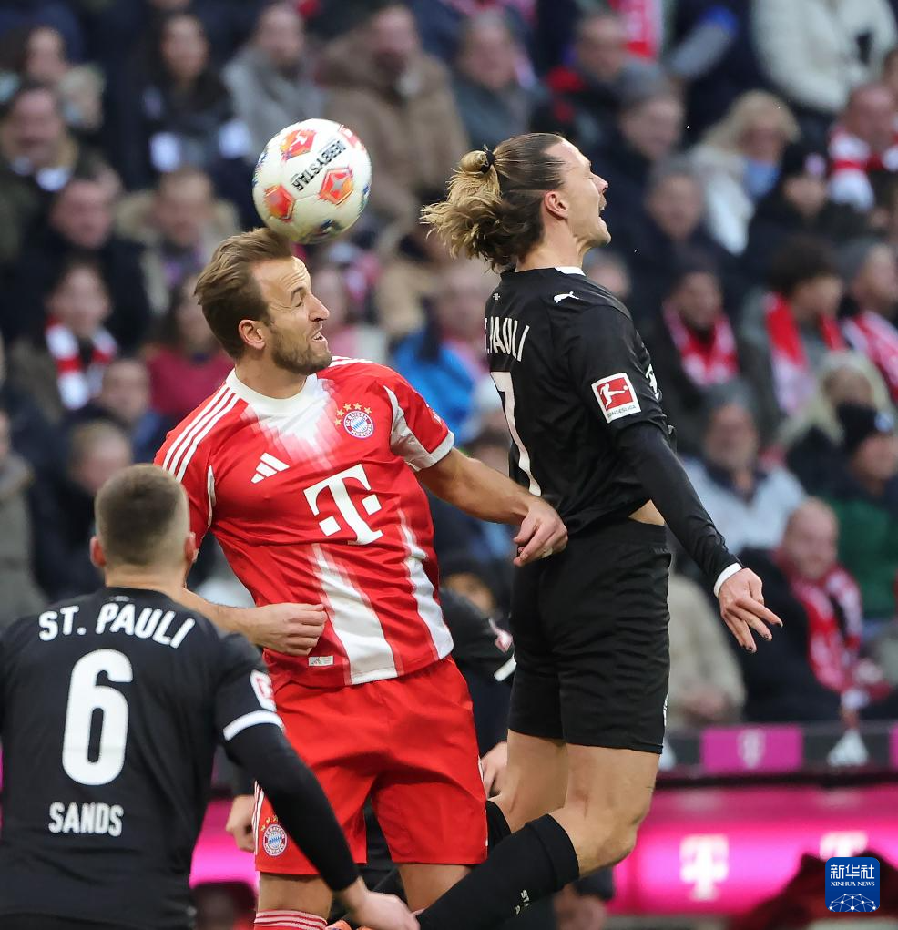 11月29日,拜仁慕尼黑队球员凯恩(中)和圣保利队球员欧文(右)在比赛中争顶。