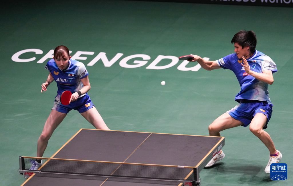 11月30日,日本队组合早田希娜/户上隼辅(右)在混双比赛中。最终,他们3比0战胜澳大利亚队组合吴佳牧娃/卢伟。