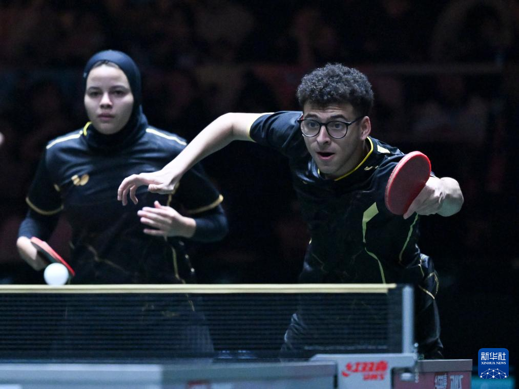 12月1日,埃及队组合巴德尔·穆斯塔法(右)/玛尔娃·阿尔霍达比在混双比赛中。他们0比3不敌中国队组合蒯曼/林诗栋。
