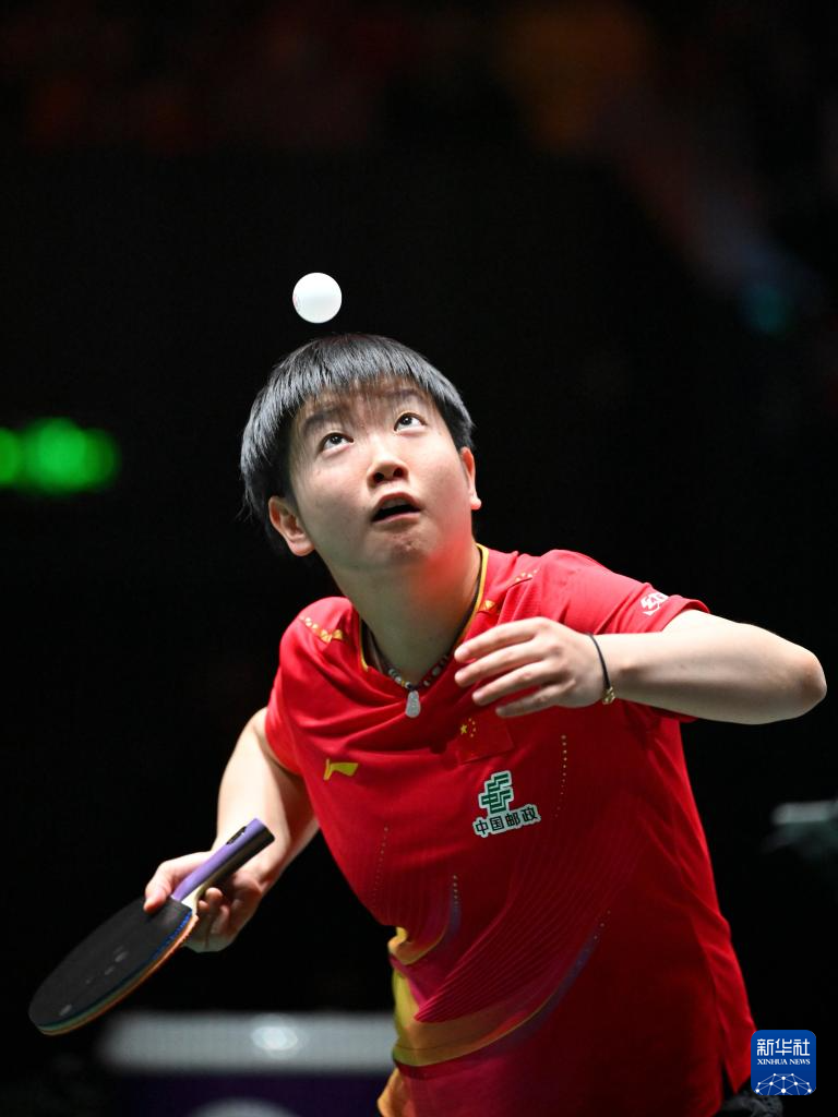 12月1日,中国队选手孙颖莎在女单比赛中发球。她3比0战胜埃及队选手马里亚姆·阿尔霍达比。