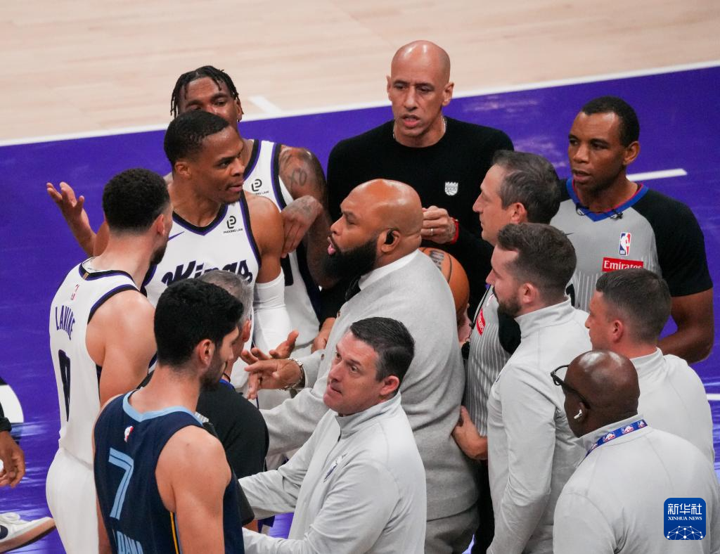 11月30日,国王队球员威斯布鲁克(左中)在比赛中犯规后跟裁判理论。