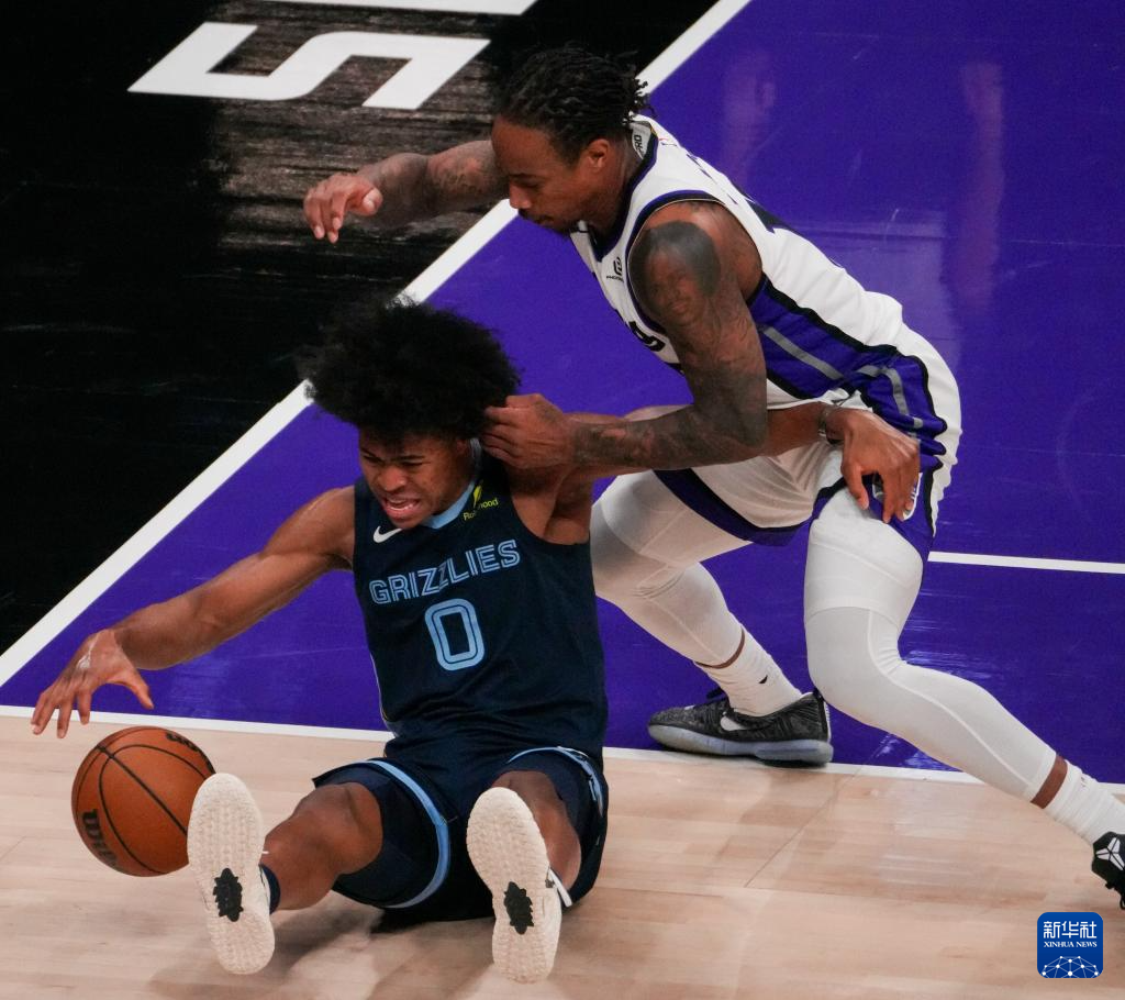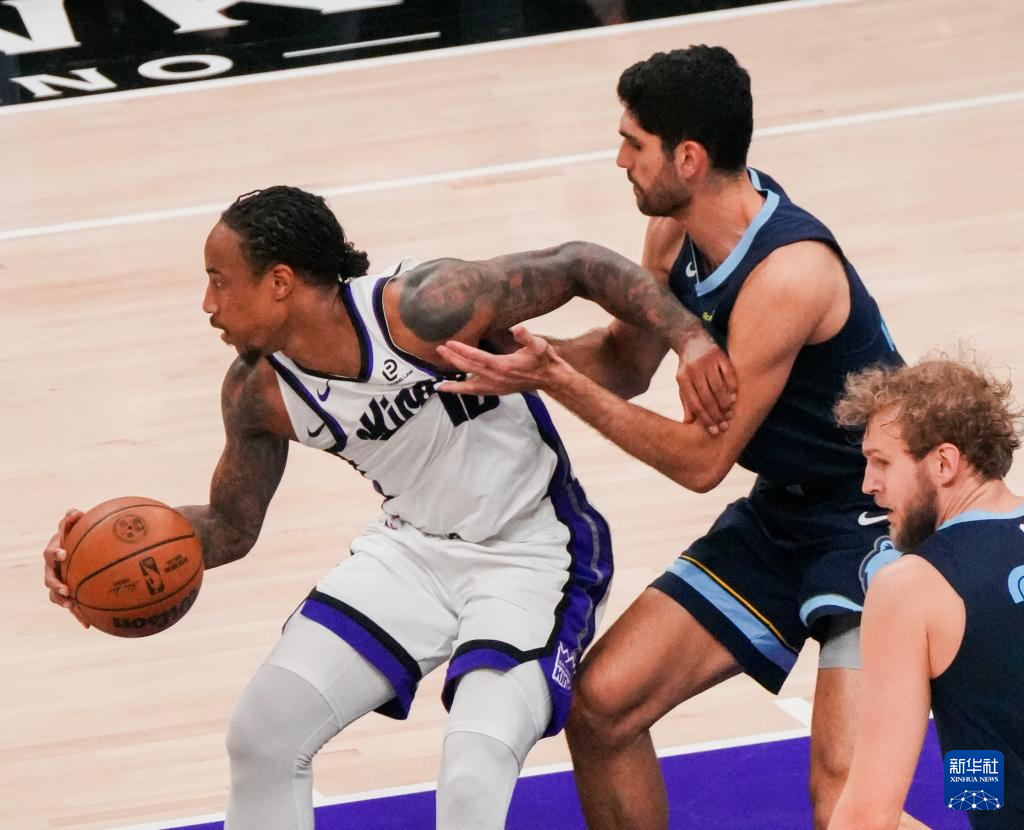 11月30日,灰熊队球员威尔斯(左)和国王队球员德罗赞在比赛中拼抢。