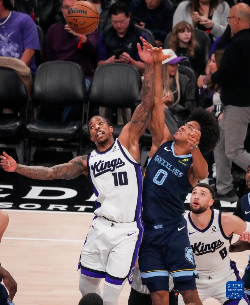 11月30日,灰熊队球员威尔斯(上右)和国王队球员德罗赞(上左)在比赛中跳球。
