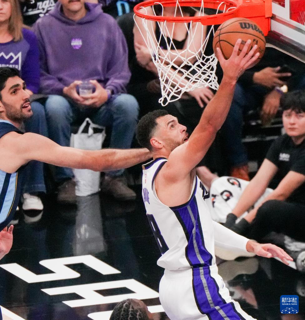 11月30日,国王队球员扎克·拉文(右)在比赛中上篮。