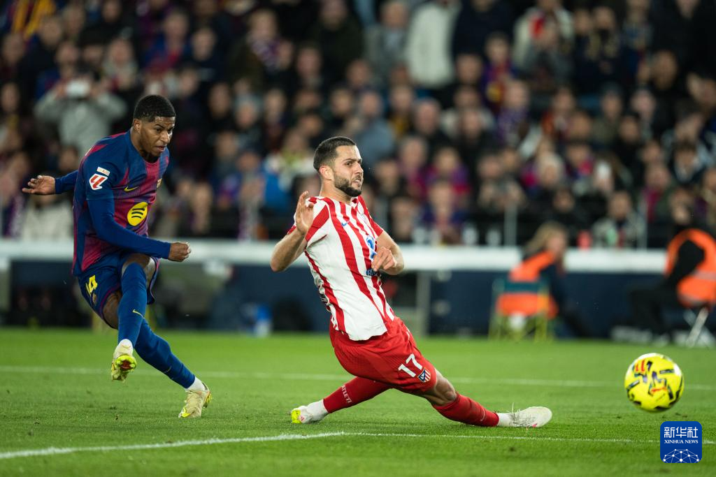 12月2日,巴塞罗那队球员拉什福德(左)在比赛中射门。
