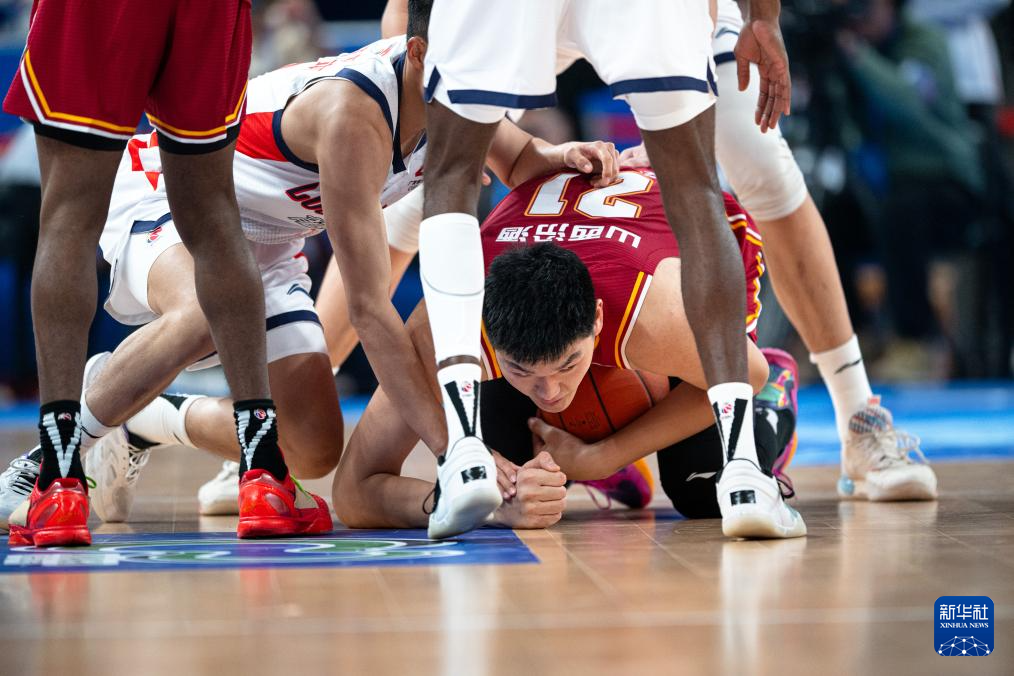 12月3日,山西汾酒队球员刘传兴(下)在比赛中护球。