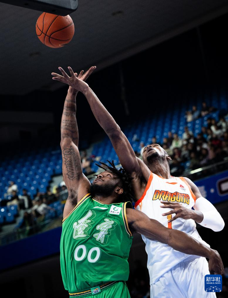12月3日,辽宁本钢队球员付豪(右)在比赛中争抢篮板球。
