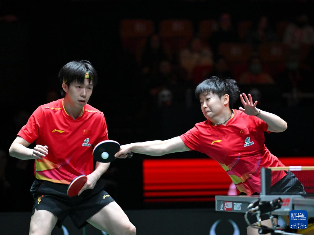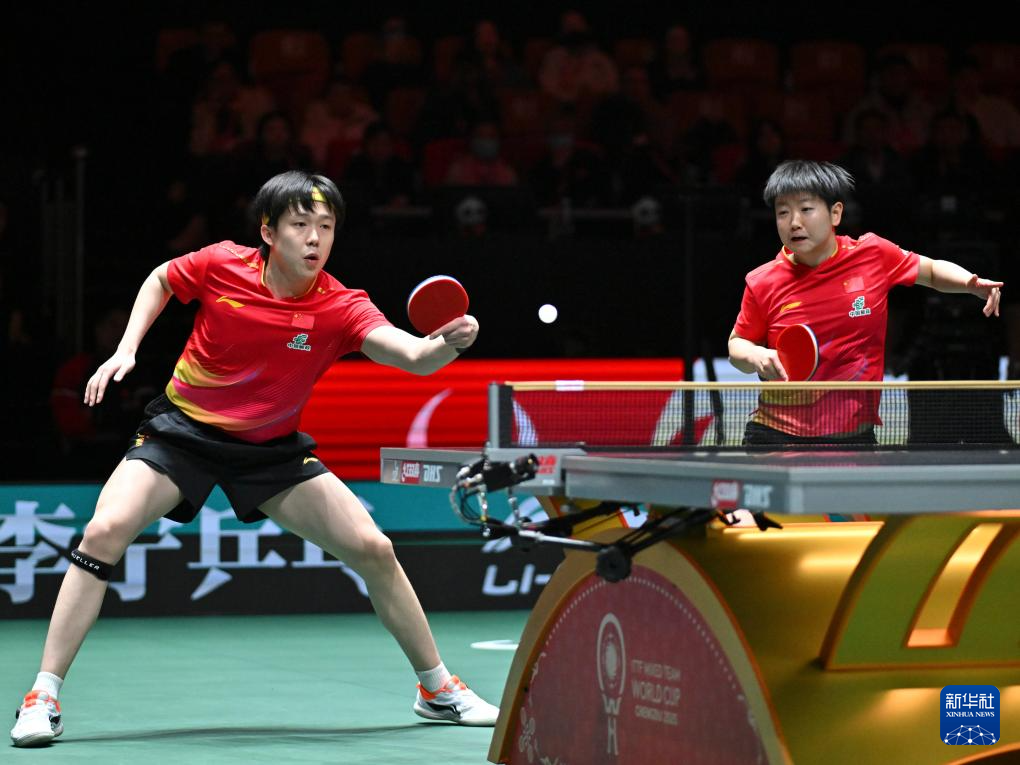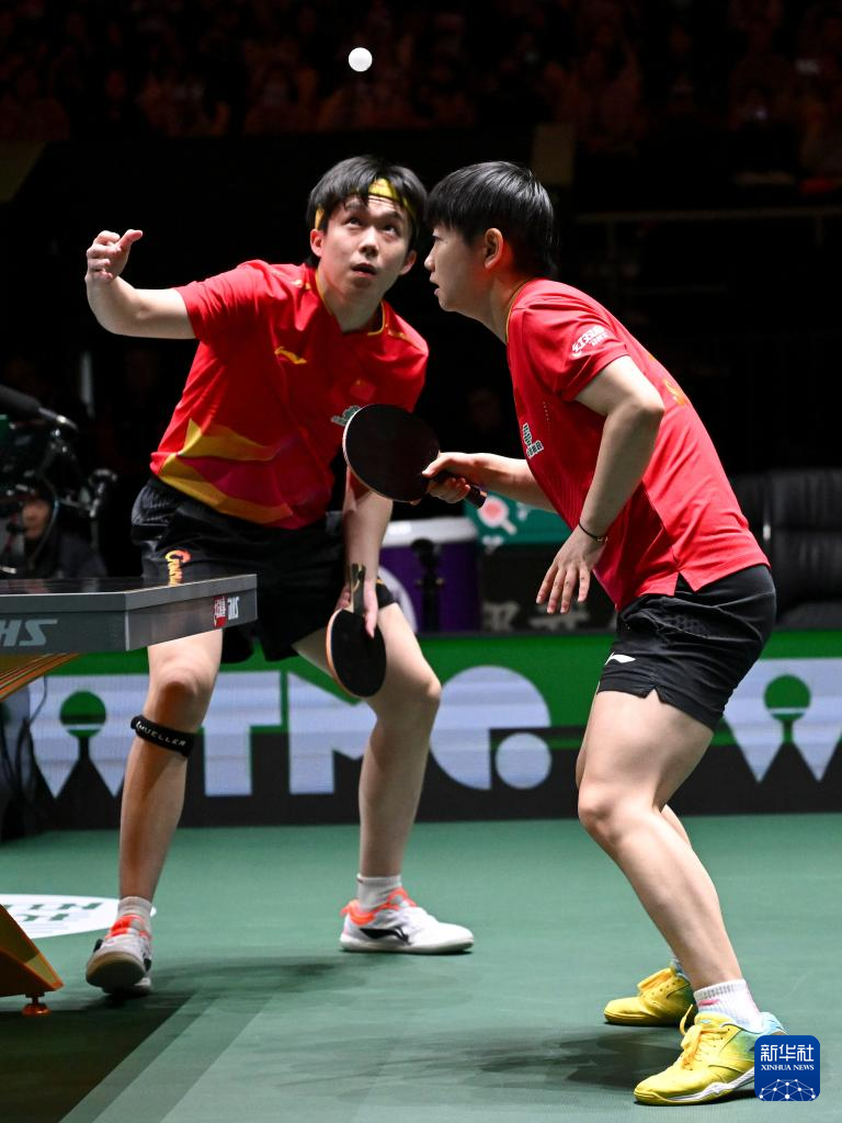 12月4日,中国队组合王楚钦(左)/孙颖莎在混双比赛中。他们3比0战胜法国队组合艾利克斯·勒布伦/袁嘉楠。