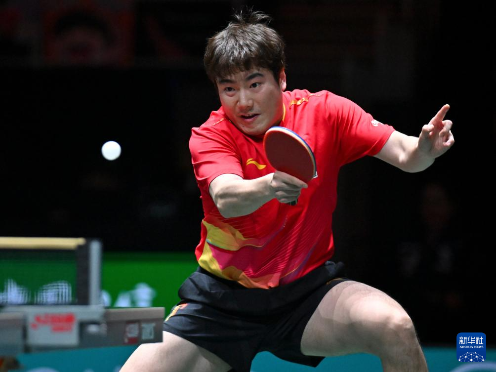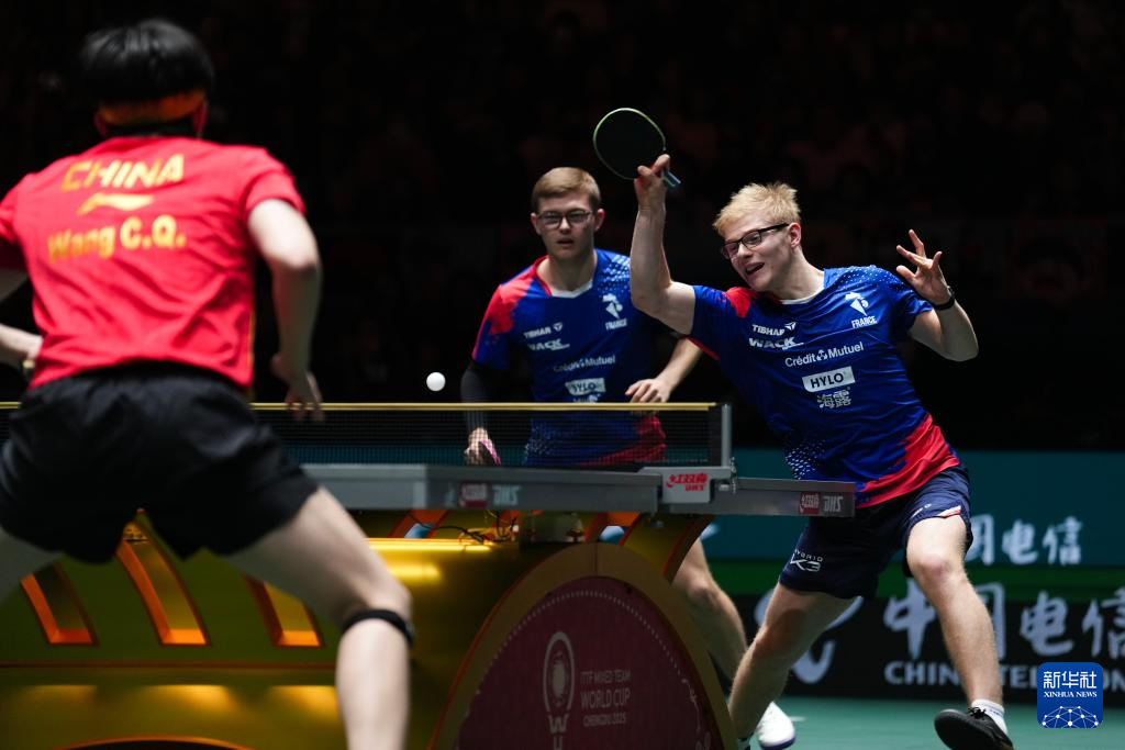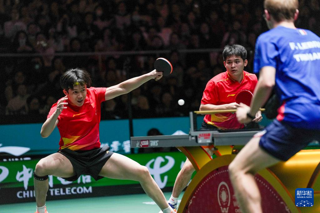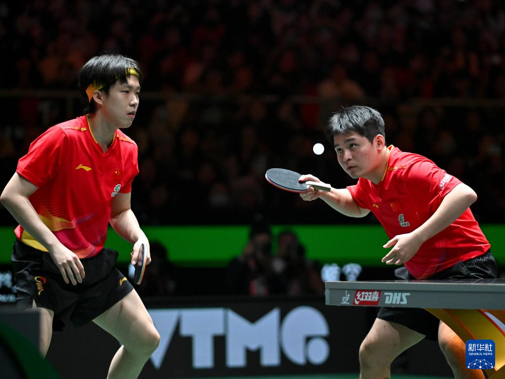 12月4日,中国队组合王楚钦/林诗栋(右)在男双比赛中。他们1比0战胜法国队组合艾利克斯·勒布伦/费利克斯·勒布伦。