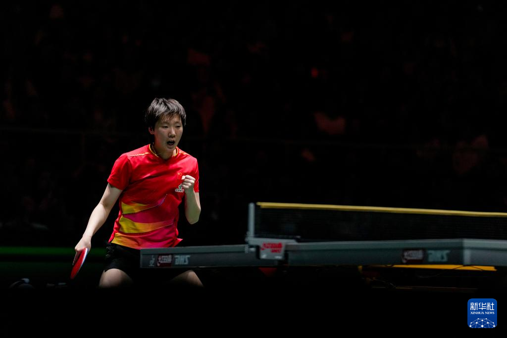 12月4日,中国队选手王曼昱在女单比赛中庆祝。她3比0战胜法国队选手普利蒂卡·帕瓦德。