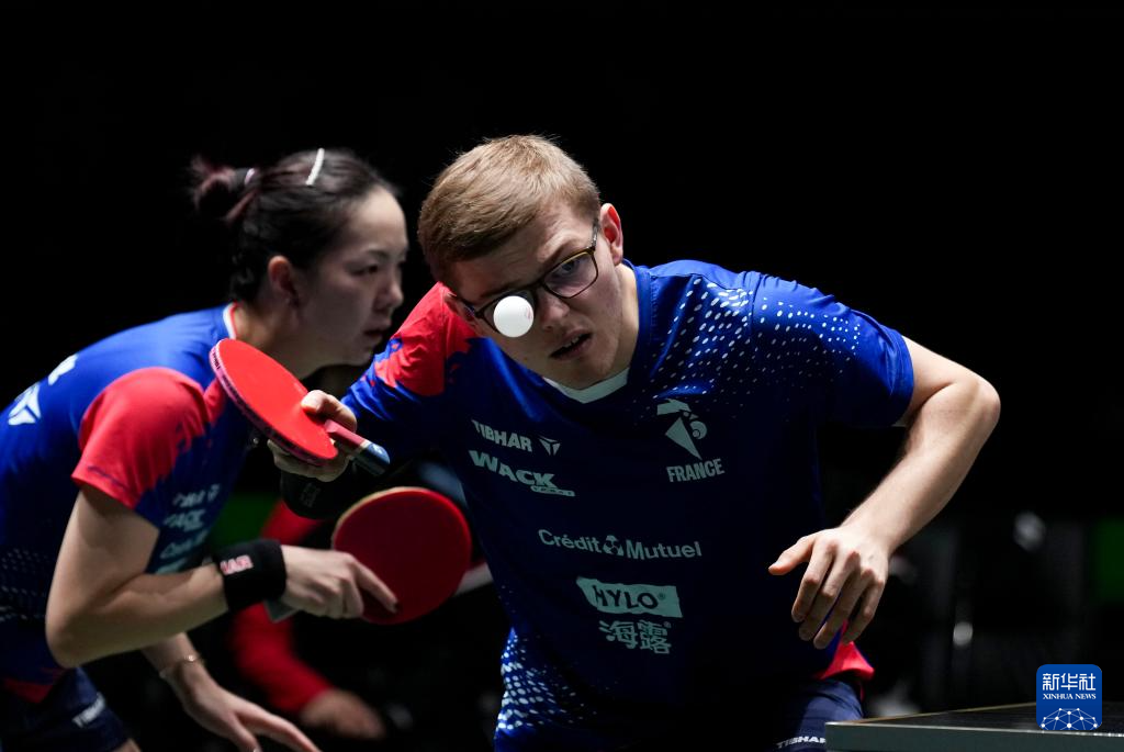 12月4日,法国队组合艾利克斯·勒布伦/袁嘉楠(左)在混双比赛中。他们0比3不敌中国队组合王楚钦/孙颖莎。