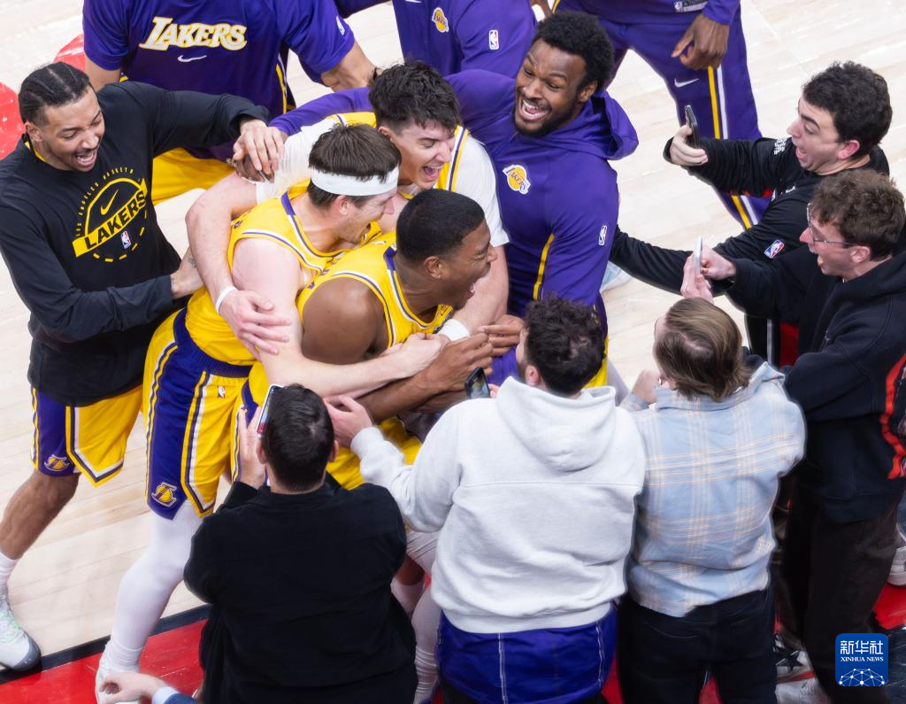 12月4日,湖人队球员八村塁(中)与队友在比赛后庆祝胜利。