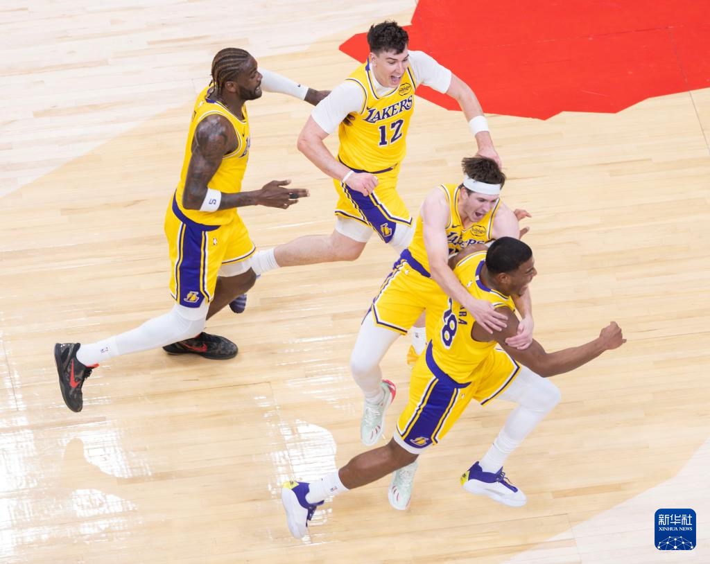 12月4日,湖人队球员八村塁(左前)庆祝命中绝杀三分球。
