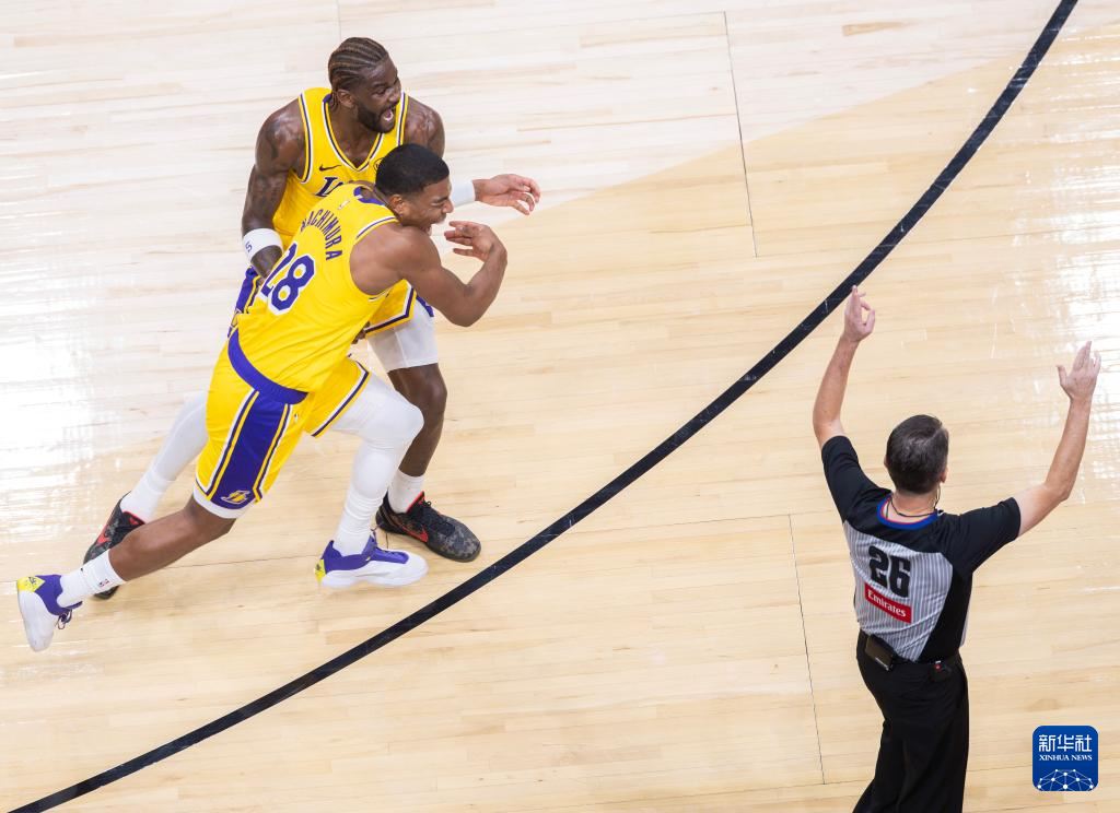 12月4日,湖人队球员里夫斯(左上)在比赛中投篮。