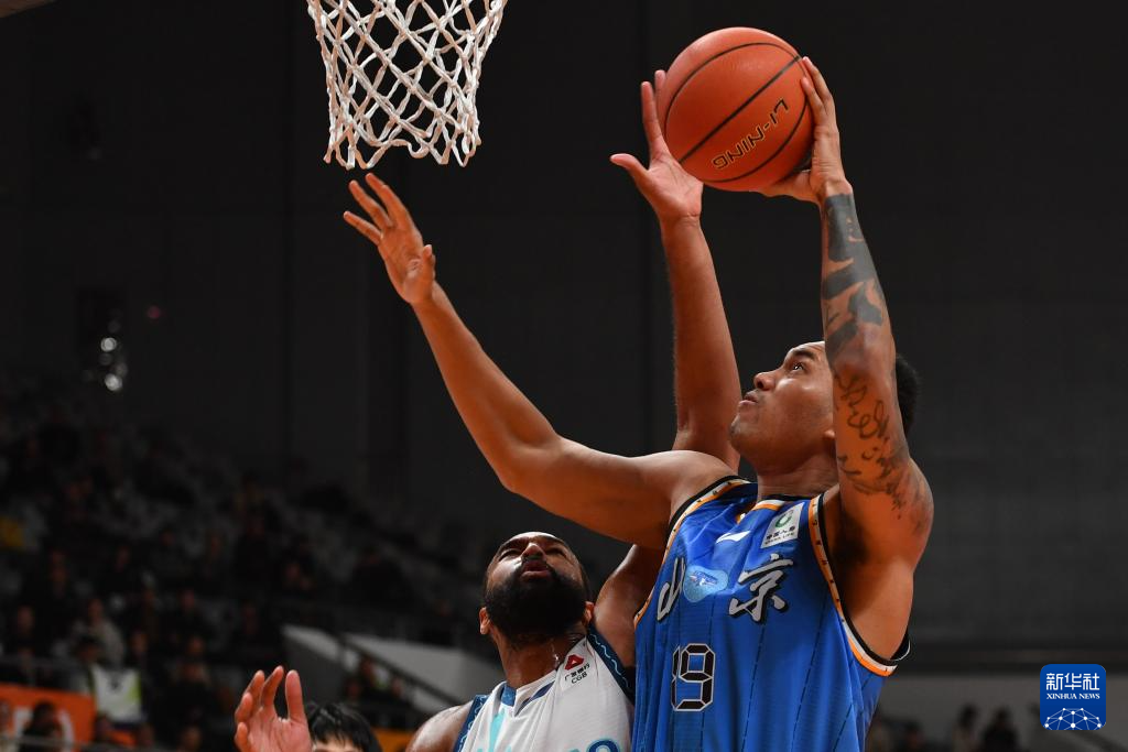 12月4日,北京北汽队球员杰曼(右)在比赛中上篮。