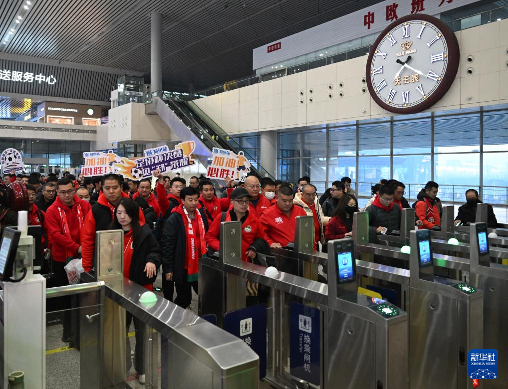 12月6日,河南俱乐部酒祖杜康队球迷在郑州东站检票进站。