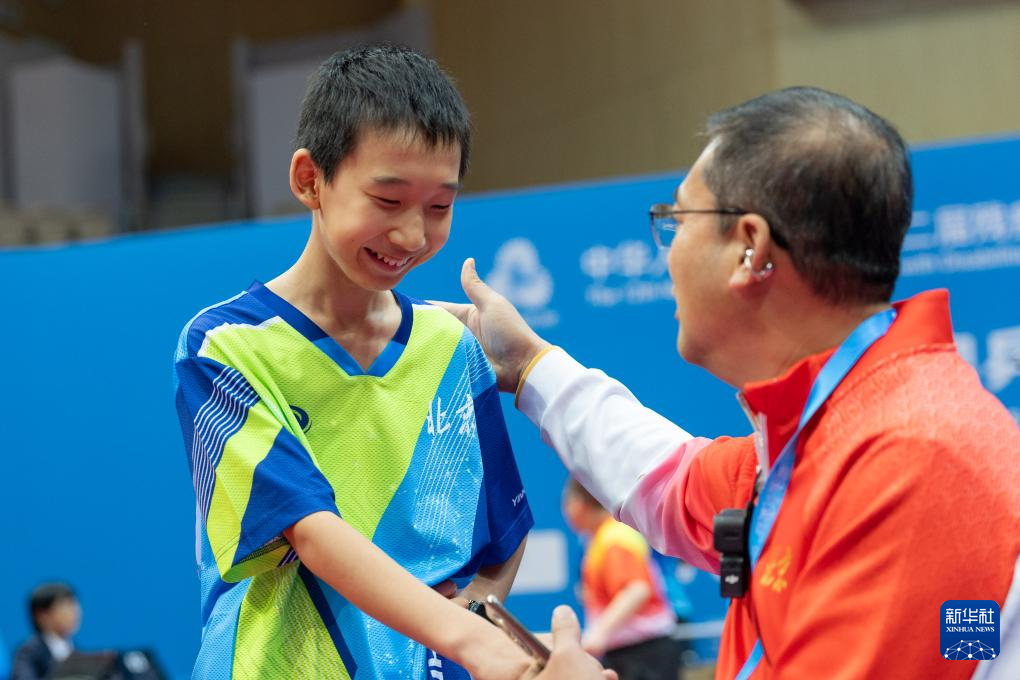 12月6日,北京队选手王亮(左)在男子单打8-11岁、12-15岁合并组比赛中与教练交流。