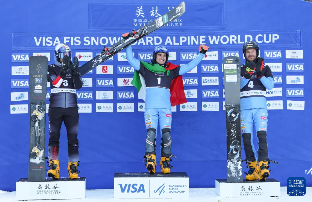 12月6日,冠军意大利选手毛里齐奥(中)、亚军奥地利选手本杰明(左)和季军意大利选手阿伦在颁奖仪式上庆祝。