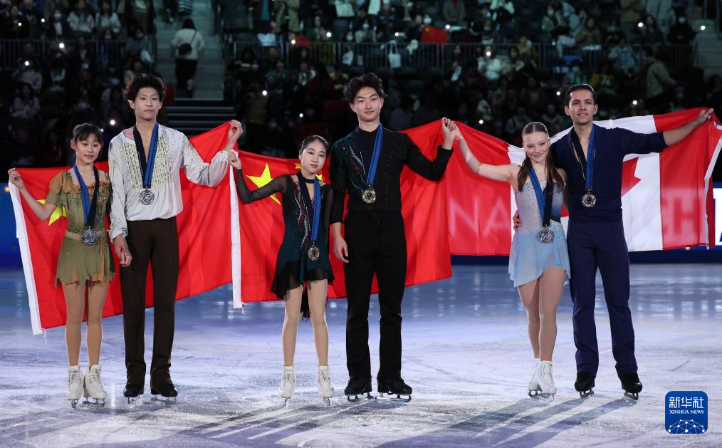 12月6日,冠军中国组合郭蕊(左三)/张益文(右三)、亚军中国组合张轩绮(左一)/丰闻强(左二)与季军加拿大组合肯普(右二)/叶利扎罗夫在青年组双人滑颁奖仪式后合影。