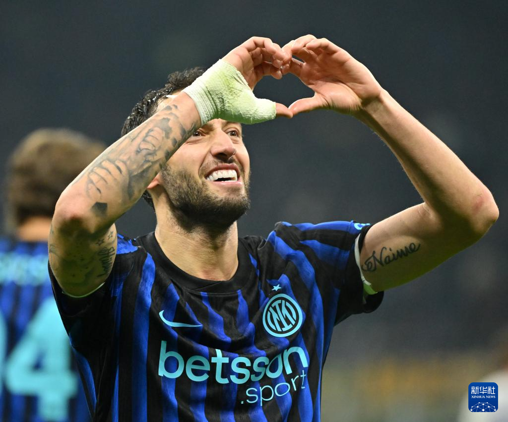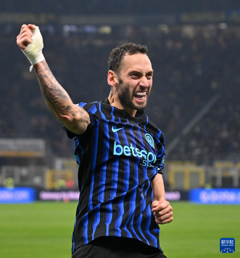 12月6日,国际米兰队球员恰尔汗奥卢庆祝进球。