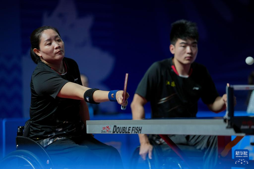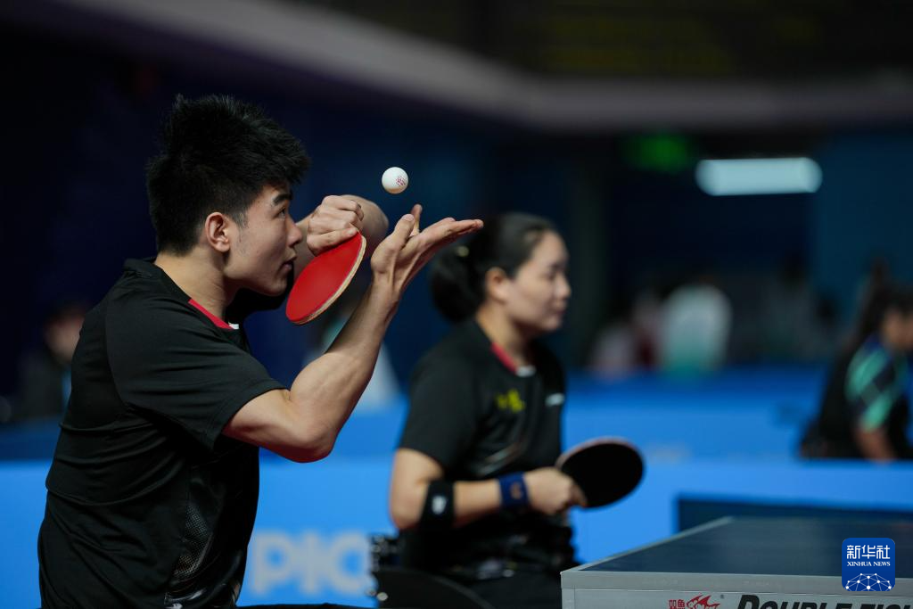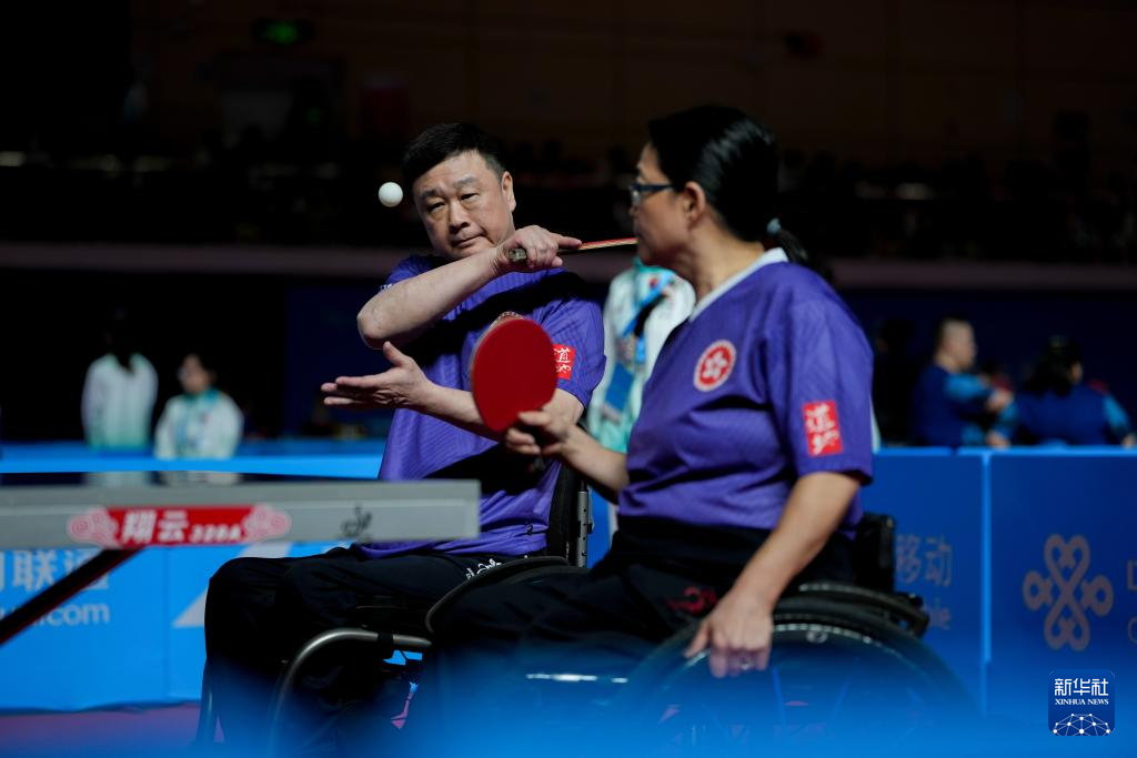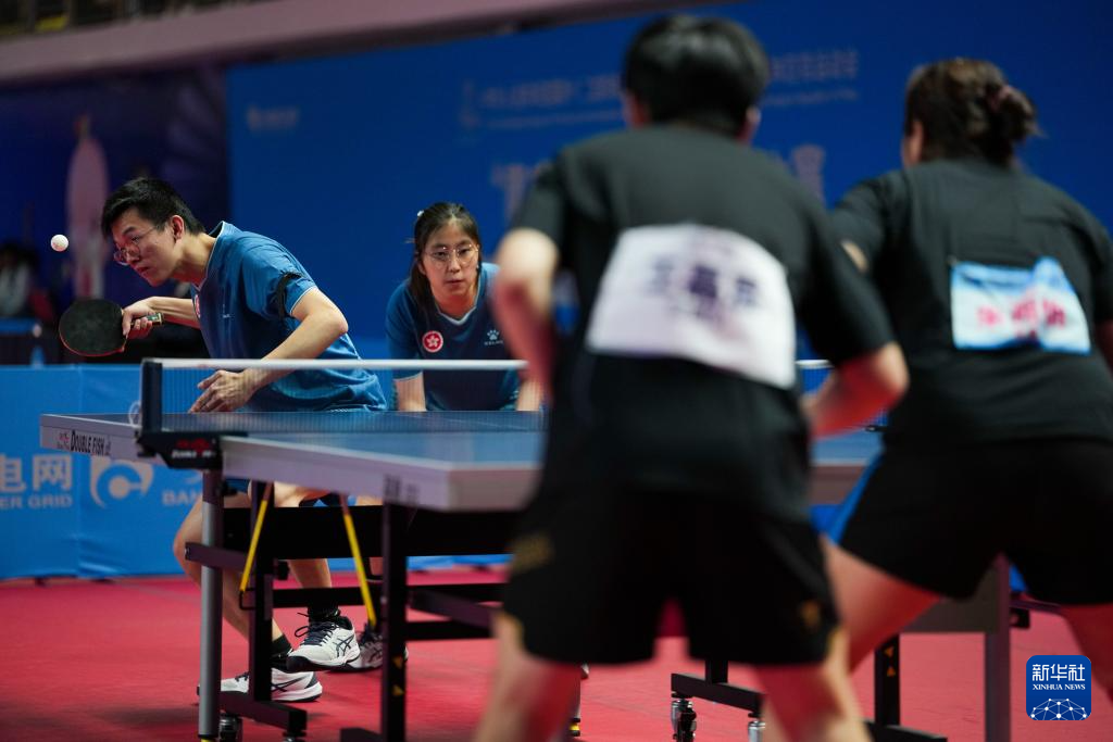 12月8日,香港一团组合蔡兆雄(左)/黄佩仪在乒乓球XD10混合双打小组赛中。最终,他们0比3不敌江苏队组合彭政扬/张变。