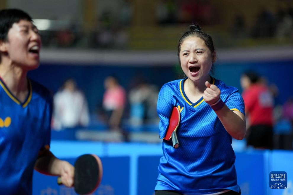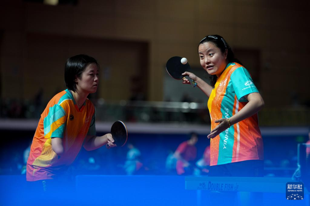 12月8日,北京队组合茅经典(右)/赵小静在乒乓球TT10女子双打小组赛中。最终,她们3比1战胜甘肃队组合刘旭/周迪奋。