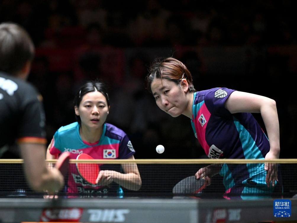 12月7日,韩国队组合金娜英/朴康贤(左)在混双比赛中。他们1比2不敌德国队组合安妮特·考夫蔓/邱党。