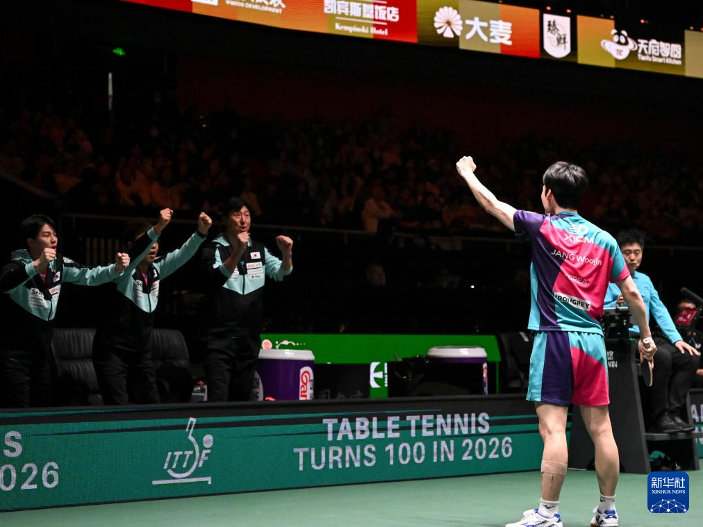 12月7日,韩国队选手张禹珍(右)在男单比赛中庆祝。他2比1战胜德国队选手帕特里克·弗朗西斯卡。