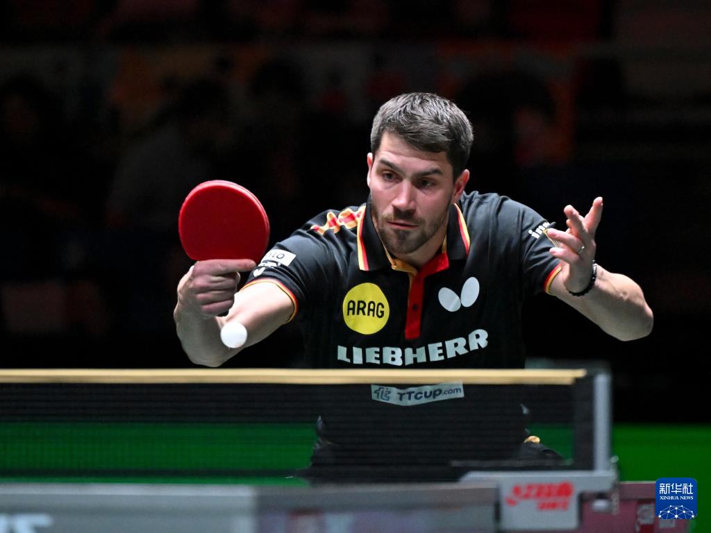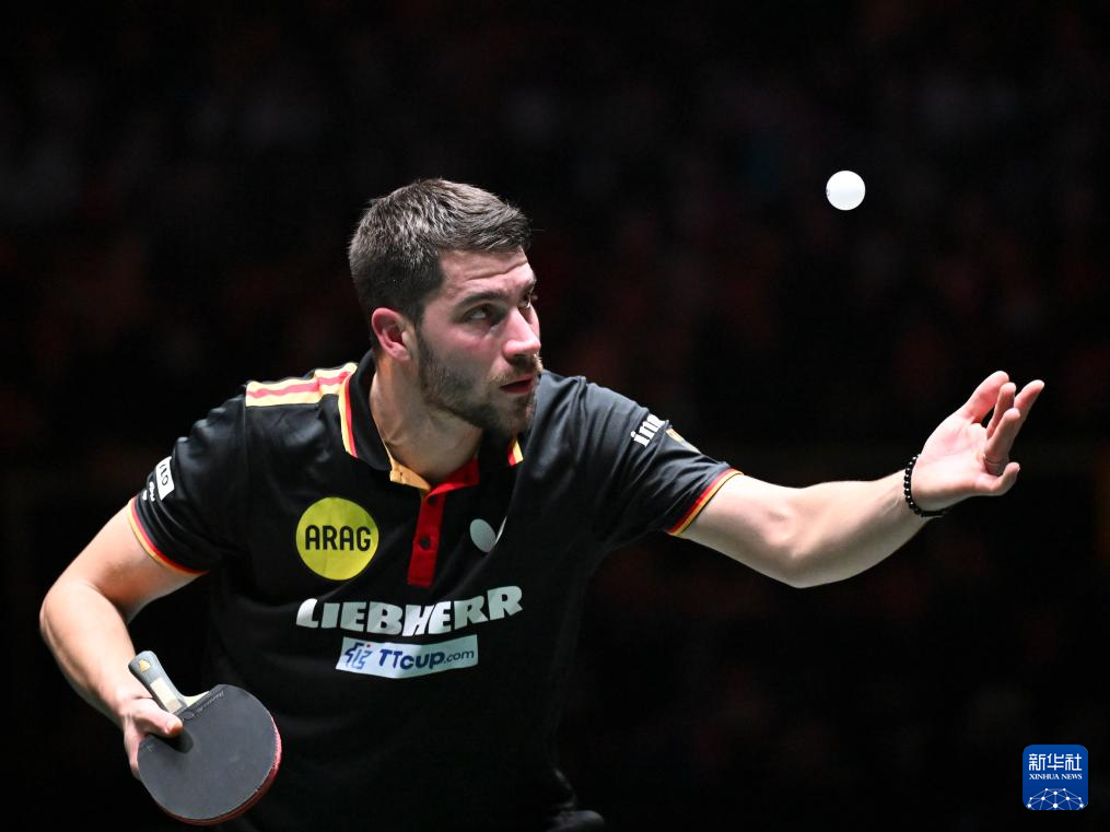 12月7日,德国队选手帕特里克·弗朗西斯卡在男单比赛中回球。他1比2不敌韩国队选手张禹珍。