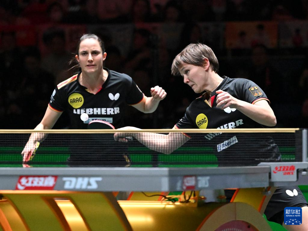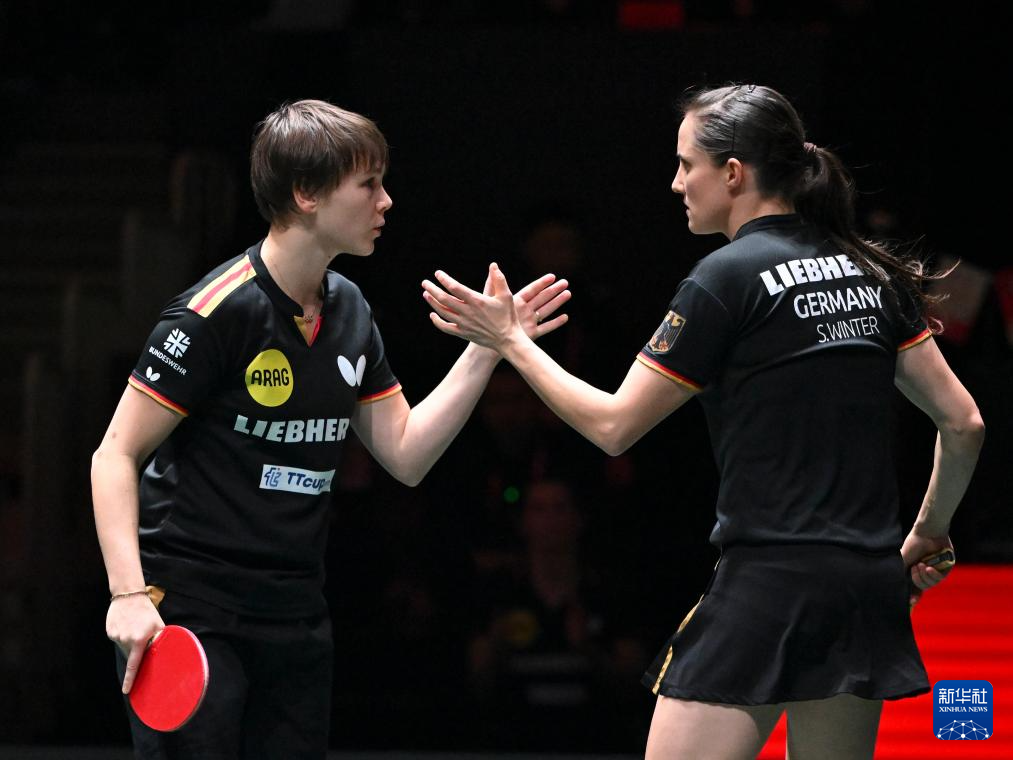 12月7日,德国队组合沙宾·温特/尼娜·米特兰姆(左)在女双比赛中庆祝。她们2比1战胜韩国队组合李恩惠/崔孝珠。