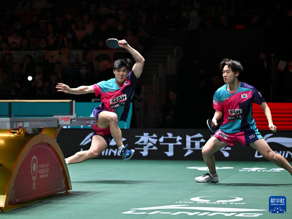 12月7日,韩国队组合朴康贤(左)/吴睃诚在男双比赛中。他们1比2不敌德国队组合贝内迪克特·杜达/邱党。