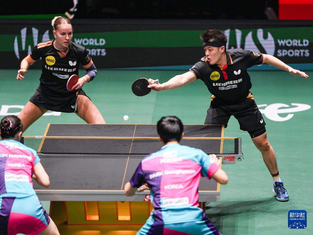 12月7日,德国队组合安妮特·考夫蔓(左二)/邱党(右一)在混双比赛中。他们2比1战胜韩国队组合金娜英/朴康贤。
