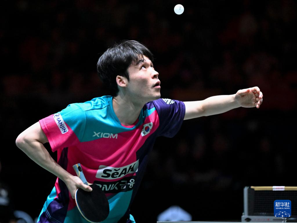 12月7日,韩国队选手张禹珍在男单比赛中发球。他2比1战胜德国队选手帕特里克·弗朗西斯卡。