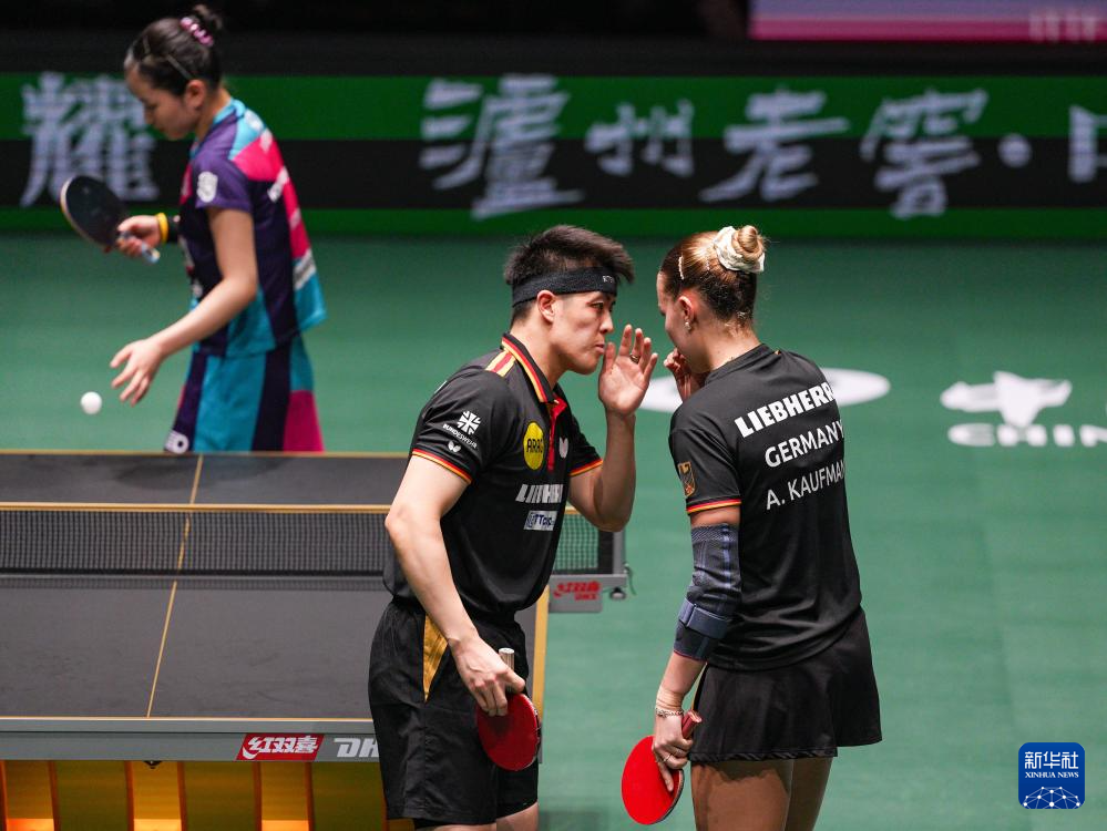 12月7日,德国队组合安妮特·考夫蔓/邱党(左)在混双比赛中商讨战术。他们2比1战胜韩国队组合金娜英/朴康贤。