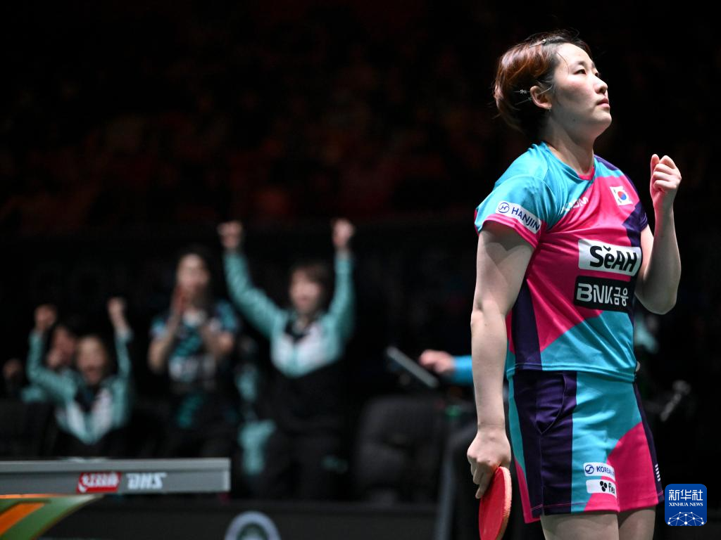 12月7日,韩国队选手李恩惠在女单比赛中庆祝。她2比1战胜德国队选手沙宾·温特。