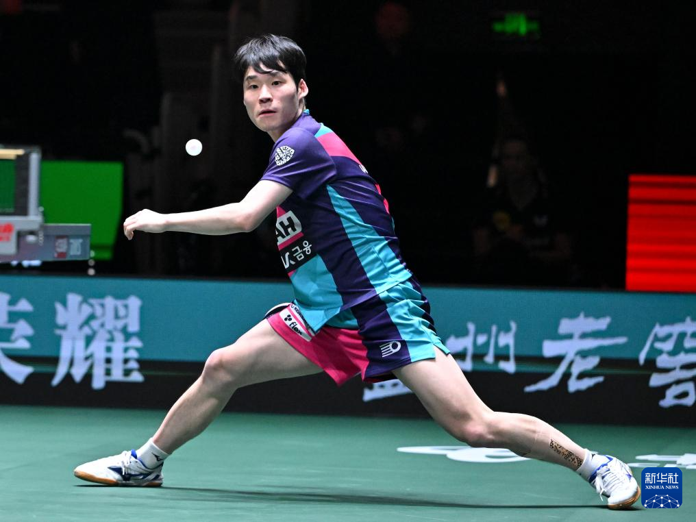 12月7日,韩国队选手张禹珍在男单比赛中回球。他2比1战胜德国队选手帕特里克·弗朗西斯卡。