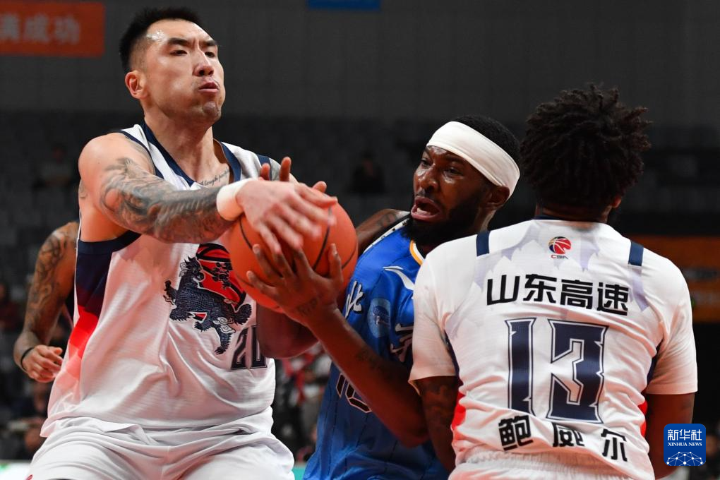 12月7日,山东高速队球员郭凯(前右)和北京北汽队球员斯佩尔曼(前左)在比赛中拼抢。