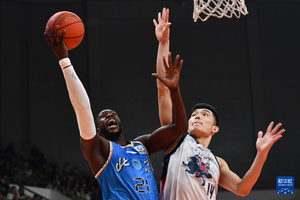 12月7日,北京北汽队球员马帝昂(左)在山东高速队球员郭凯防守下上篮。