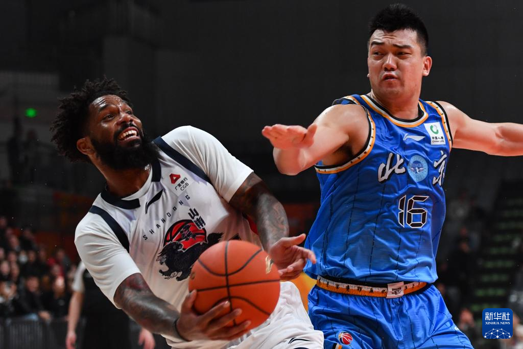 12月7日,山东高速队球员克里斯(左)在北京北汽队球员斯佩尔曼防守下上篮。