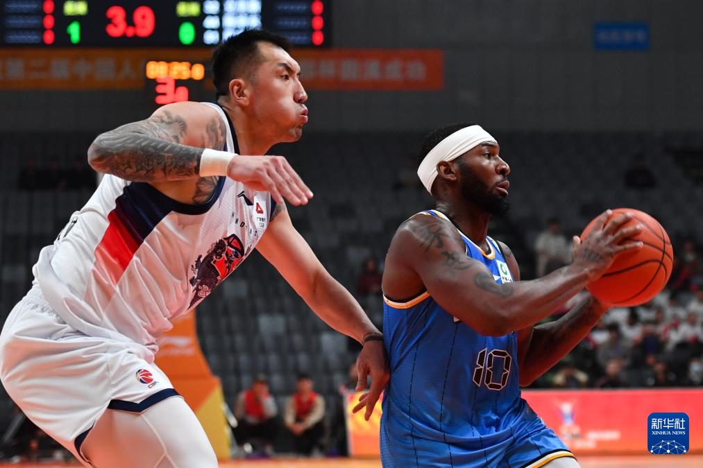 12月7日,北京北汽队球员杰曼(右)在山东高速队球员陶汉林防守下进攻。