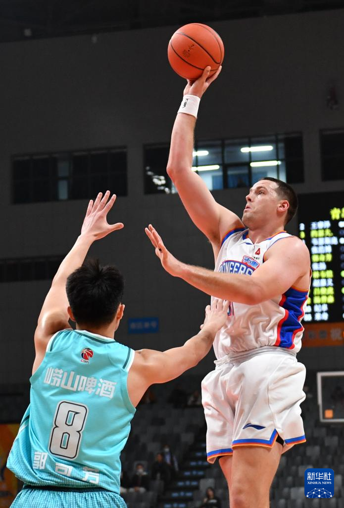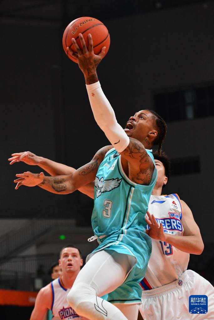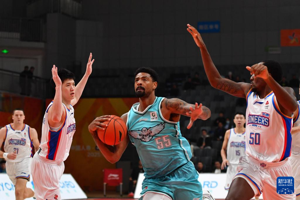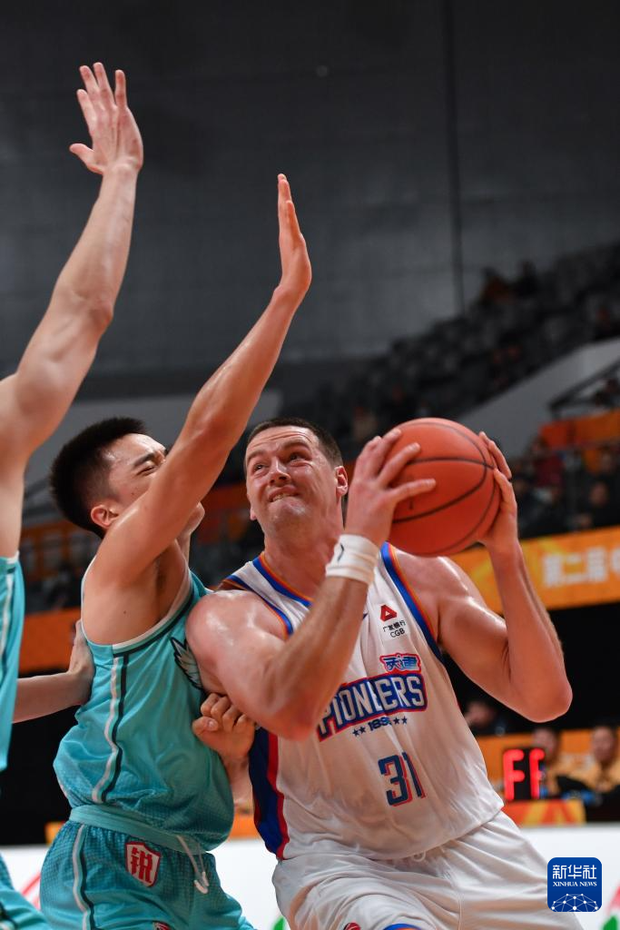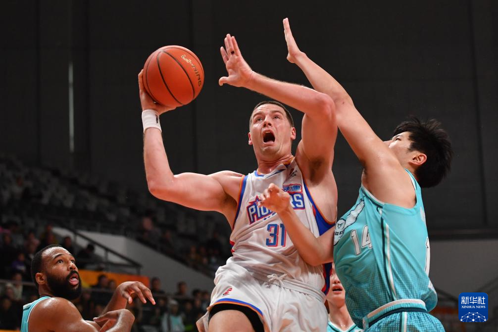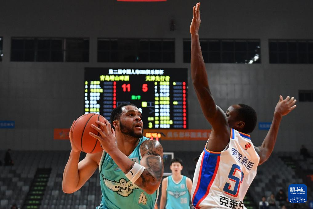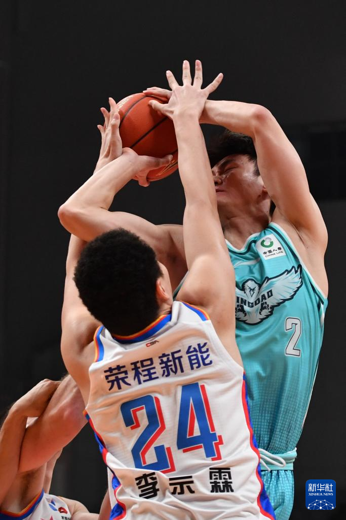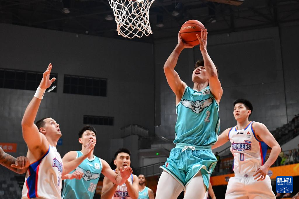 12月7日,青岛崂山啤酒队球员王睿泽(右二)在比赛中上篮。