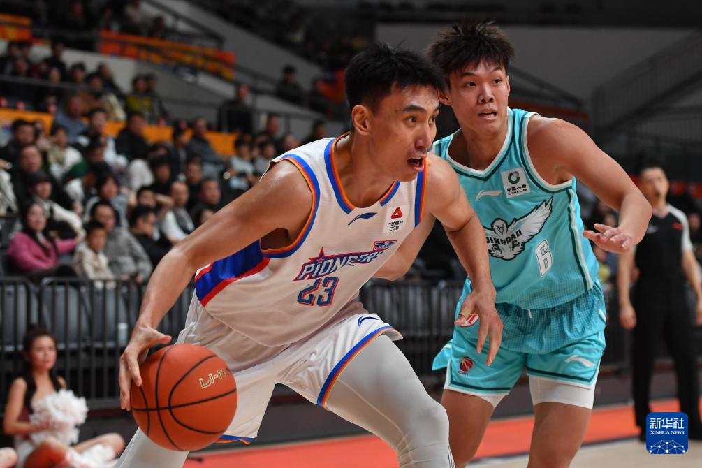 12月7日,青岛崂山啤酒队球员王睿泽(右)在比赛中进攻。