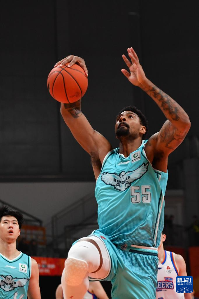 12月7日,青岛崂山啤酒队球员韦瑟斯庞(左)在比赛中进攻。