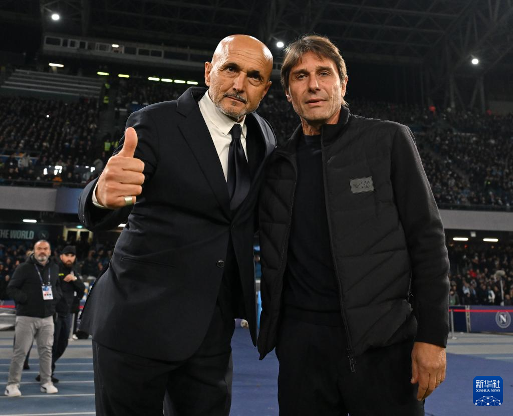 12月7日,那不勒斯队主教练孔蒂(右)与尤文图斯队主教练斯帕莱蒂在赛前合影。
